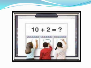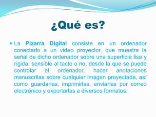 La pizarra digital consiste en un ordenador conectado a un proyector que muestra la imagen del ordenador sobre una superficie lisa y rígida. Esto permite controlar el ordenador y hacer anotaciones manuscritas sobre cualquier imagen proyectada. Existen dos tipos principales de pizarra digital: la PDI, que se usa desde la propia superficie de proyección, y la PDIP, que es portátil y permite controlar el ordenador y hacer anotaciones desde cualquier lugar del aula.
