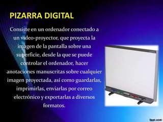 La pizarra digital permite proyectar la pantalla de un ordenador sobre una superficie táctil que permite controlar el ordenador, hacer anotaciones y guardarlas en diferentes formatos. Existe la pizarra digital interactiva de gran formato (PDi) que se usa desde la propia superficie de proyección y la portátil (PDiP) que se puede usar desde cualquier lugar. La pizarra digital facilita presentaciones multimedia e interactivas en el aula de manera sencilla.