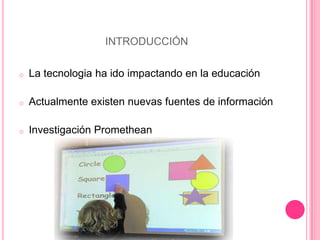 Este documento presenta los resultados de una investigación sobre el uso de pizarras digitales interactivas (PDI) en el aula. Los hallazgos muestran que los profesores utilizan la PDI en más del 60% de las clases y que aumenta la motivación y participación de los estudiantes. Aunque los estudiantes aprenden más con la PDI, sus calificaciones solo mejoraron un 2%. El documento concluye que la PDI facilita el desarrollo de competencias, pero que las evaluaciones siguen enfocándose en la memorización.