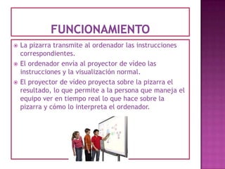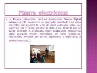La pizarra interactiva consiste en un ordenador conectado a un proyector que muestra la señal del ordenador sobre una superficie sensible al tacto, permitiendo controlar el ordenador y hacer anotaciones que pueden guardarse, imprimirse o enviarse. Ofrece ventajas como adaptarse a diferentes modos de enseñanza y beneficiar a estudiantes con dificultades visuales u auditivas, aunque requiere formación del profesorado y puede resultar cara.