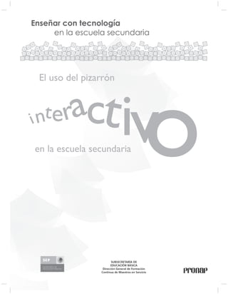 Este documento presenta un manual sobre el uso del pizarrón interactivo en la escuela secundaria. Explica que el pizarrón interactivo es una tecnología que permite visualizar y manipular información de la computadora a través de una superficie táctil o una pluma electrónica. Describe las funciones básicas del pizarrón como escribir y borrar como un pizarrón tradicional, proyectar contenido de la computadora, y permitir interacción con recursos almacenados. El manual provee orientación para que maest
