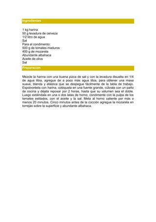 Este documento proporciona instrucciones para hacer pizza casera. Detalla los ingredientes necesarios como harina, levadura, agua y sal y las etapas de la preparación que incluyen amasar la masa, dejarla leudar, extenderla en una lata, condimentarla con tomate, queso mozzarella y albahaca y hornearla.