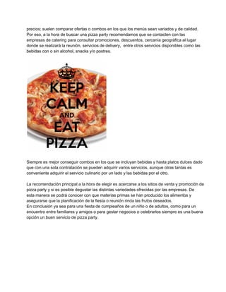 Los servicios de pizza party ofrecen una opción excelente para organizar fiestas o reuniones, ya sea para pocas o más personas. Proporcionan entrega de alimentos especializados para eventos, calculando adecuadamente las porciones y variedades según el número de invitados. Al contratar un servicio de pizza es importante considerar la calidad y variedad de los alimentos, y para especialidades más exóticas, recurrir a empresas con mayor experiencia y renombre.