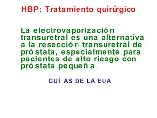 El documento presenta los resultados de un estudio retrospectivo de 39 pacientes sometidos a electrovaporización prostática mediante el sistema Gyrus Plasmakinetic entre abril de 2008 y marzo de 2009. Los resultados mostraron una baja tasa de complicaciones, una recuperación rápida y mejoras significativas en los síntomas y el flujo urinario.
