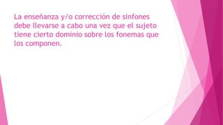 El documento presenta una guía para la enseñanza y corrección del fonema /pl/ (sinfón). Se recomienda comenzar con la emisión aislada y repetición silábica del sinfón, luego emitir la consonante /p/ de manera prolongada uniéndola a vocales, repetir sílabas rápidamente eliminando vocales, y finalmente leer palabras y frases que contengan el fonema /pl/. También incluye trabalenguas, adivinanzas y ejercicios de lectura relacionados con este sonido.