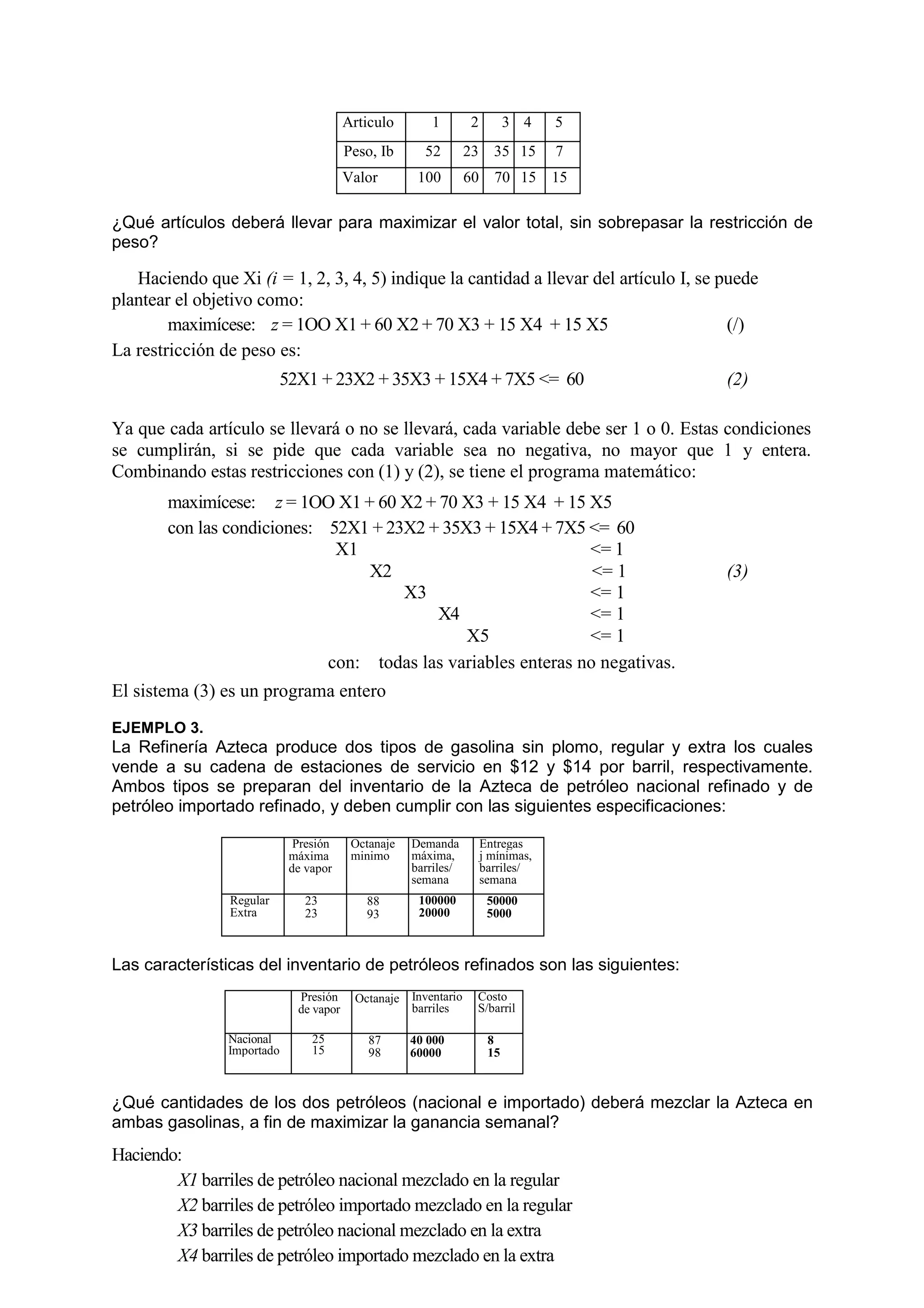 El documento presenta 6 ejemplos de problemas de programación lineal resueltos. Cada ejemplo describe un problema de la vida real, define las variables de decisión e incluye las restricciones y el objetivo para formular el modelo matemático correspondiente como un programa lineal. Los ejemplos cubren temas como la mezcla de ingredientes, la asignación de recursos, la producción y la publicidad.