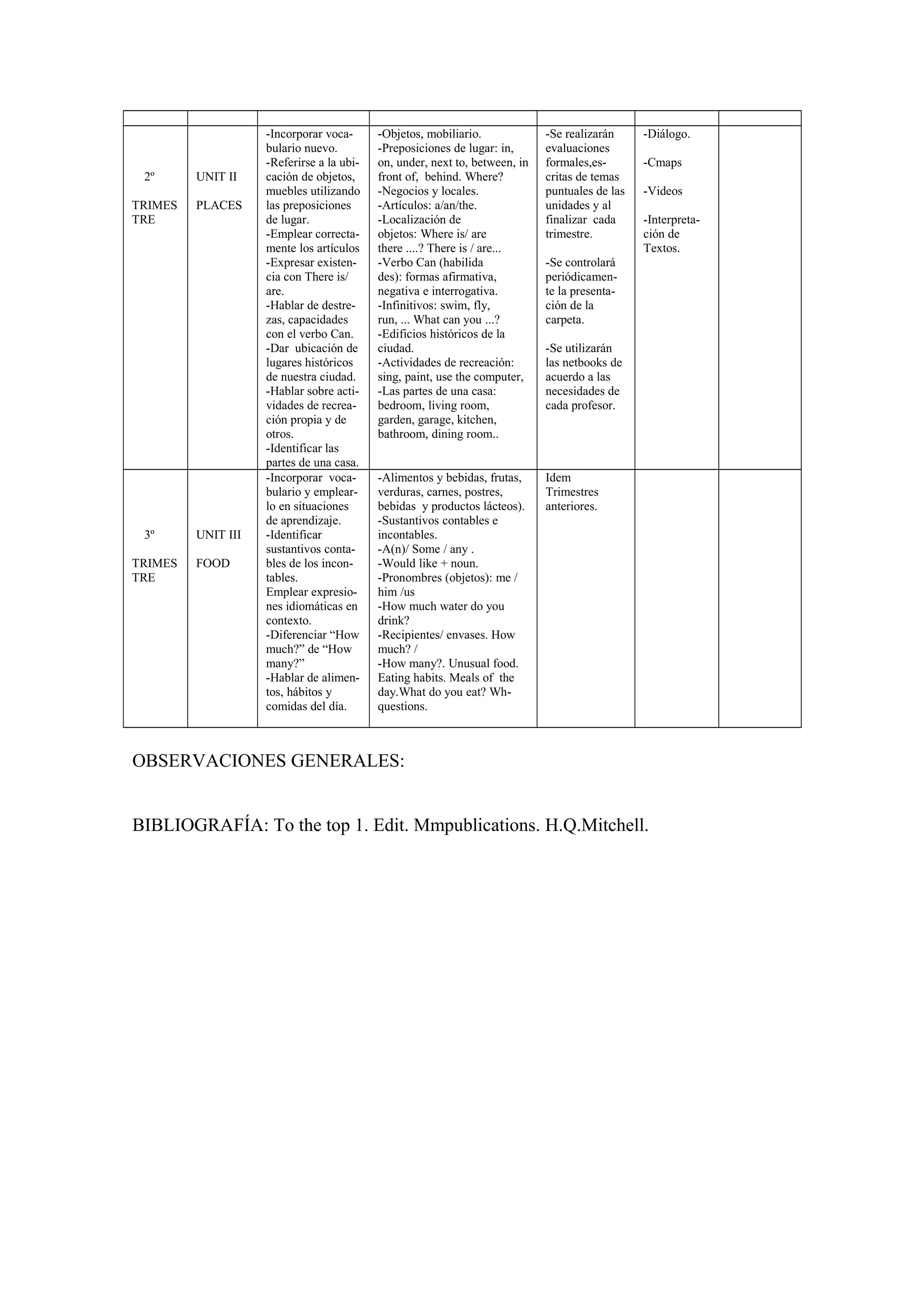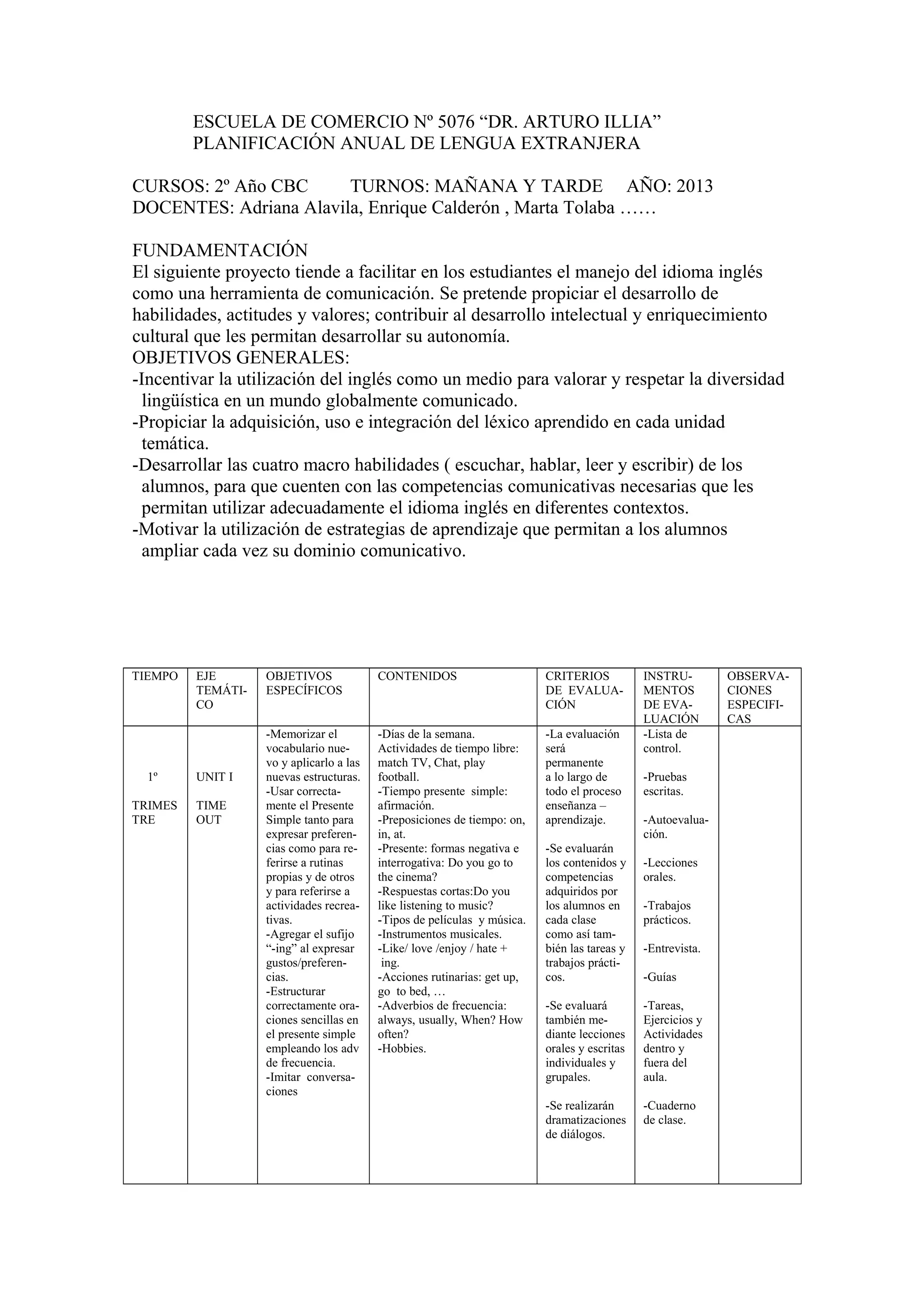 Este documento presenta el plan anual de inglés para 2o año de la Escuela de Comercio No 5076 “Dr. Arturo Illia”. El plan tiene como objetivo desarrollar las habilidades comunicativas de los estudiantes en inglés a través de tres unidades temáticas. Cada unidad aborda objetivos específicos, contenidos lingüísticos, y criterios de evaluación. El plan también detalla los instrumentos que se utilizarán para evaluar el aprendizaje de los estudiantes a lo largo del año.
