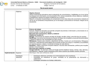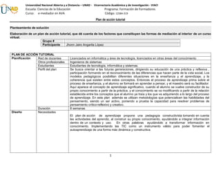 El documento presenta un plan de acción tutorial de 8 semanas que busca orientar a estudiantes de tecnología e informática mediante un enfoque constructivista y el uso de las TIC. El plan involucra a docentes, estudiantes e ingenieros y propone objetivos, recursos, estrategias, actividades, evaluación y acompañamiento para promover el aprendizaje colaborativo y el desarrollo de habilidades a través de plataformas y herramientas como Edmodo, Moodle, blogs y wikis.
