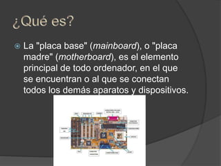 La placa base es el elemento principal de un ordenador donde se conectan todos los demás componentes. Incluye el chipset, BIOS, ranuras como ISA, PCI, AGP, zócalos para el procesador y módulos de memoria RAM. También contiene puertos y conectores para periféricos como teclado, mouse, discos duros, USB, audio y video.