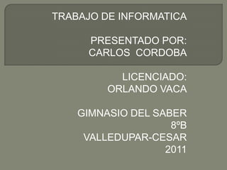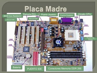 Este documento describe los principales componentes de una computadora, incluyendo la ranura PCI, el puerto de joystick, los puertos paralelos, la ranura AGP, el zócalo CPU, los puertos IDE, la ranura CNR, el BIOS, la memoria RAM, y la fuente de poder. Explica brevemente la función de cada uno de estos componentes centrales en el hardware de una computadora.