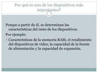 La placa madre es el dispositivo más importante porque determina las características del resto de los componentes de la PC. Controla voltajes, rendimiento de componentes internos y de expansión. Incluye componentes integrados como controladores de video, sonido, red y puertos. Cuenta con buses de control, datos y dirección para la comunicación entre dispositivos. Incluye slots como PCI Express para tarjetas de expansión y conectores para la alimentación y datos de otros dispositivos.