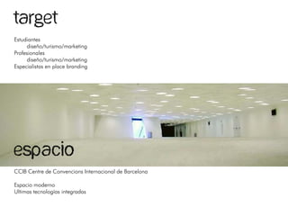 Este documento proporciona información sobre una conferencia de marca de lugar que tendrá lugar en el Centro de Convenciones Internacional de Barcelona. La conferencia está dirigida a estudiantes y profesionales de diseño, turismo y marketing, así como especialistas en marca de lugar. La agenda incluye presentaciones sobre los orígenes de la marca de lugar, ciudades y sus marcas, marca de lugar y diplomacia pública, y marca de lugar y comunicación europea. La conferencia también ofrecerá una zona de cafetería, áreas para conferencias y