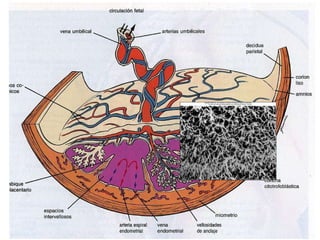 El documento describe la placenta, incluyendo su morfología, partes fetal y materna, circulación fetal, funciones, fisiología del transporte, endocrinología, variaciones de forma y anormalidades. La placenta es un órgano temporal que permite el intercambio de nutrientes y gases entre la madre y el feto durante el embarazo.