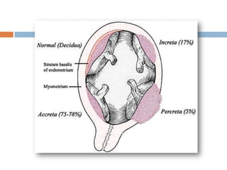 La placenta previa ocurre cuando la placenta se implanta en la parte baja del útero, cubriendo parcial o totalmente la entrada al cuello uterino y obstaculizando el parto vaginal. Requiere cesárea para el nacimiento y puede causar hemorragia durante el embarazo. El diagnóstico se realiza mediante ultrasonido y el tratamiento involucra reposo, monitoreo y posible resolución del embarazo de manera anticipada.