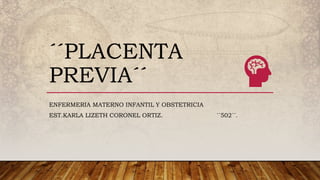 La placenta previa ocurre cuando la placenta se implanta en la parte baja del útero y cubre parcialmente o totalmente la abertura del cuello uterino. Puede diagnosticarse mediante ecografía y los principales síntomas son sangrados vaginales brillantes después de las 20 semanas de gestación. El tratamiento incluye reposo en cama y una cesárea al final del embarazo para evitar hemorragias durante el parto.