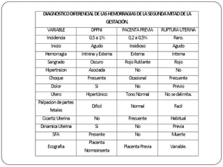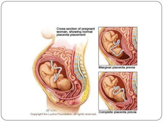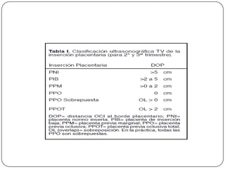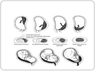 La placenta previa se define como la implantación parcial o total de la placenta en el segmento inferior del útero. Los factores de riesgo incluyen cesáreas previas, edad avanzada y multiparidad. El cuadro clínico se caracteriza por hemorragias vaginales asintomáticas. El diagnóstico se realiza con ultrasonido transvaginal. El tratamiento consiste en reposo, vigilancia y parto por cesárea programada después de la maduración pulmonar fetal.
