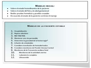 La placenta previa es una condición obstétrica en la que la placenta se implanta en la parte inferior del útero, causando potenciales complicaciones como hemorragias. Puede clasificarse en cuatro tipos según su relación con el cuello uterino y tiene factores de riesgo significativos, como cesáreas previas y edad materna avanzada. El manejo puede incluir cesárea o medidas conservadoras dependiendo de la gravedad de los síntomas y la gestación.