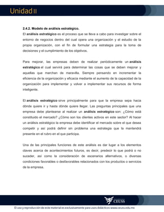 El documento describe el modelo de análisis estratégico que las empresas realizan para evaluar su entorno interno y externo, identificar fortalezas, debilidades, oportunidades y amenazas, y formular una estrategia efectiva. El análisis estratégico incluye una evaluación del mercado, clientes, competidores y factores externos, así como un análisis interno de los recursos y capacidades de la empresa para mejorar continuamente y alcanzar sus objetivos.