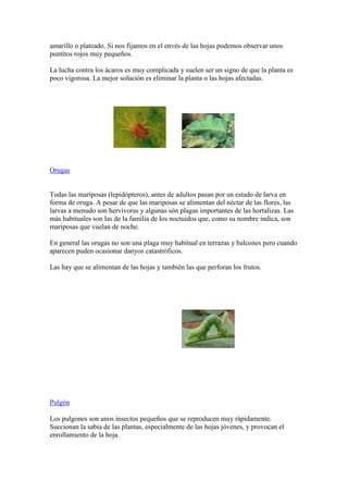 Las plagas más comunes en huertos caseros incluyen hormigas, la mosca blanca, la araña roja, orugas y pulgones. Hormigas pueden dañar raíces y transportar pulgones de planta a planta. La mosca blanca se alimenta de tomates y otras solanáceas. La araña roja es un ácaro que causa hojas amarillas o plateadas. Las orugas son larvas de mariposas que a menudo son herbívoras y dañan hortalizas. Los pulgones succionan sav