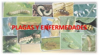 Este documento describe las plagas y enfermedades que afectan a los cultivos agrícolas. Las plagas incluyen insectos, ácaros y nematodos que dañan las plantas de diferentes maneras, como masticando hojas, enrollándolas o perforando frutos. Las enfermedades son causadas por microorganismos como virus, bacterias y hongos. También se describen los diferentes métodos para controlar las plagas y enfermedades, como controles mecánicos, químicos, biológicos y genéticos.