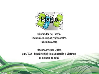 Este documento define el plagio, identifica sus características y tipos, y explica cómo evitarlo. El plagio se define como deshonestidad académica y ocurre cuando se toman ideas, palabras o escritos de otros sin darles crédito. Hay dos tipos de plagio: intencional y inconsciente. Se comete plagio al entregar trabajos de otros como propios, reescribir textos sin citar, copiar imágenes sin crédito, o utilizar ideas principales sin reconocer al autor. Para evitarlo, se debe citar siempre la fu