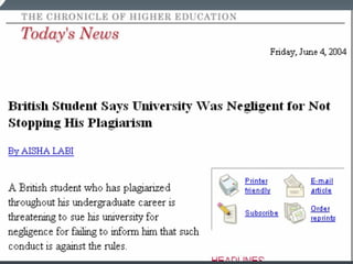 Este documento define el plagio estudiantil y explora sus causas. Menciona que el plagio puede ser intencional o inconsciente y lista algunas fuentes comunes donde los estudiantes pueden plagiar. También describe cómo se puede detectar el plagio a través del análisis del estilo, las citas y el contenido. Finalmente, ofrece algunas estrategias para prevenir el plagio como enseñar a los estudiantes sobre citación correcta y diseñar tareas que no se puedan copiar directamente de internet.