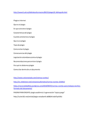 El documento proporciona información sobre plagio, incluyendo una definición, características, tipos de plagio, cómo evitarlo y consecuencias. También incluye enlaces a páginas web sobre normas para citar fuentes y evitar el plagio en documentos académicos.
