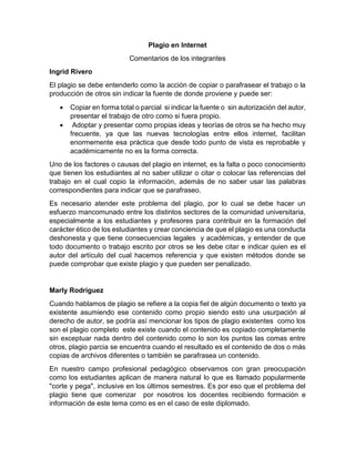 El documento discute el problema del plagio en Internet desde las perspectivas de cuatro integrantes. Explican que el plagio implica copiar el trabajo de otros y presentarlo como propio sin citar la fuente. Un factor que contribuye al plagio es la falta de conocimiento sobre cómo citar y colocar referencias correctamente. Se debe crear conciencia de que el plagio es deshonesto y tiene consecuencias legales, y enseñar a los estudiantes a analizar la información en lugar de copiar y pegar.