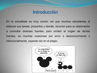 El documento habla sobre el plagio en los estudiantes, definiendo plagio, describiendo diferentes tipos de plagio e identificando cómo reconocerlo y evitarlo. Explica que el plagio implica tomar las palabras o ideas de otros y presentarlas como propias. Detalla estrategias para citar y parafrasear correctamente usando referencias bibliográficas.