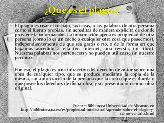 El documento define el plagio como la copia total o parcial de una obra ajena y su presentación como propia, sin acreditar debidamente al autor original. Explica que el plagio atenta los derechos morales y patrimoniales del autor verdadero. Además, enumera diversos tipos de obras protegidas por el derecho de autor y ofrece consejos para citar y parafrasear de manera adecuada al evitar el plagio.