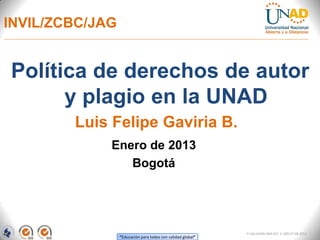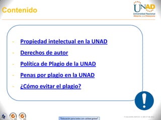 El documento detalla la política de derechos de autor y plagio en la UNAD, destacando la importancia de la propiedad intelectual y las consecuencias del plagio. Se definen las penalizaciones para estudiantes que incurran en plagio, con medidas que van desde recibir un cero en la tarea hasta la pérdida de la clase. Además, se ofrecen recomendaciones sobre cómo evitar el plagio mediante el uso adecuado de citas y herramientas de verificación.
