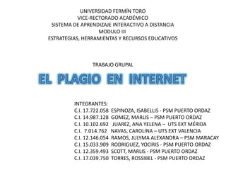 Este documento presenta un trabajo grupal realizado por 8 estudiantes sobre el tema del plagio. Explica que el plagio implica usar las ideas de otros sin darles crédito, lo cual es considerado robo intelectual. Luego discute algunas causas comunes del plagio y ofrece recomendaciones para prevenirlo, como enseñar la importancia de citar correctamente las fuentes de información.
