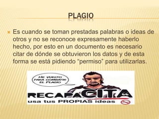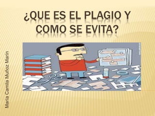 Este documento define el plagio y cómo evitarlo. El plagio ocurre cuando se toman las palabras o ideas de otros sin darles crédito. Para evitar el plagio, se debe citar directamente las fuentes o parafrasear las ideas y citarlas también. Los estudiantes deben dar crédito cuando usan ideas u opiniones de otros.