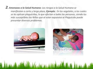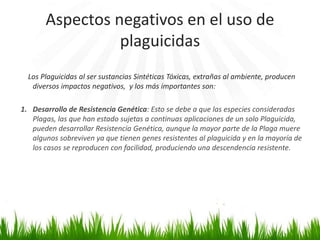 Los plaguicidas tienen efectos negativos como el desarrollo de resistencia genética en las plagas, amenazas a la salud humana como problemas de salud en niños expuestos, y amenazas a la vida silvestre al afectar especies como las abejas. Sin embargo, también tienen usos positivos como proteger cultivos y aumentar la producción de alimentos, aunque es importante seguir las indicaciones correctamente para minimizar riesgos.
