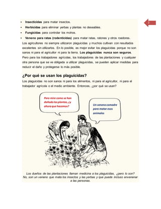 Este documento discute los peligros de los plaguicidas para la salud humana y el medio ambiente. Explica que los plaguicidas son venenos que pueden causar problemas de salud agudos y crónicos en personas expuestas, especialmente niños. También dañan el medio ambiente al matar especies no blanco y contaminar el suelo y el agua. Aunque las empresas promueven su uso para la agricultura, existen preocupaciones sobre sus efectos a largo plazo y su contribución a un sistema agrícola injusto.