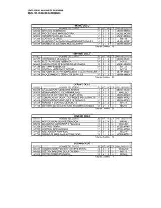 El documento detalla el plan de estudios de la Facultad de Ingeniería Mecánica de la Universidad Nacional de Ingeniería, incluyendo cursos, códigos, créditos y pre-requisitos a lo largo de varios ciclos académicos. Se listan los cursos obligatorios y electivos, así como los créditos requeridos para completar cada ciclo y la carrera. En total, se requieren 210 créditos para la especialidad, incluyendo prácticas pre-profesionales y actividades extracurriculares.