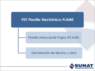 Este documento proporciona información sobre la Planilla Electrónica Mensual de Pagos (PLAME). Resume que la PLAME incluye información de remuneraciones, descuentos y datos de jornada laboral de trabajadores, así como de pensionistas. También cubre a prestadores con rentas de cuarta categoría. El documento explica cómo presentar la PLAME a través del nuevo aplicativo PDT Planilla Electrónica PLAME y los pasos para obtener los datos de empleadores y trabajadores del T-Registro para completar la declaración.