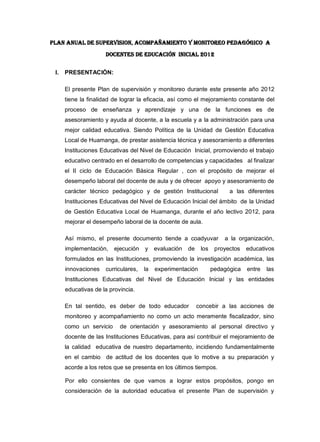 El documento presenta un plan anual de supervisión, acompañamiento y monitoreo pedagógico a docentes de educación inicial en la región de Ayacucho, Perú para el año 2012. El plan tiene como objetivo mejorar la calidad de la educación inicial a través de brindar apoyo y asesoramiento técnico a docentes. El plan describe los objetivos, metodología, metas y cronograma de actividades de supervisión a llevarse a cabo en 175 instituciones educativas de la región durante el año.