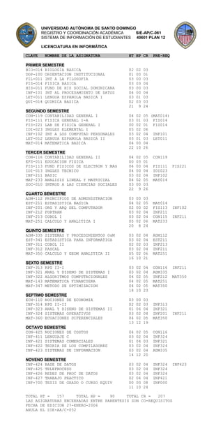 Este documento presenta el plan de estudios de la Licenciatura en Informática de la Universidad Autónoma de Santo Domingo. El plan consta de 9 semestres y cubre asignaturas de matemáticas, física, contabilidad, programación, sistemas operativos, bases de datos y redes. Algunas asignaturas tienen co-requisitos o son pre-requisitos para otras. El plan total incluye 157 horas de teoría, 90 horas prácticas y 207 créditos.
