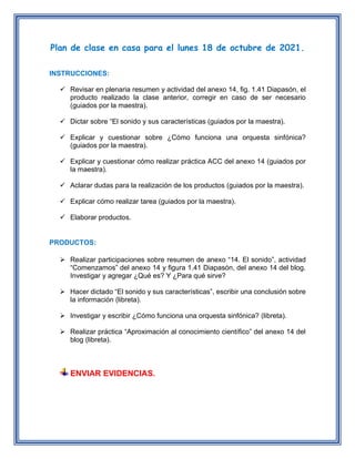El plan de clase del lunes 18 de octubre incluye revisar un resumen y actividad de la clase anterior, aprender sobre el sonido y sus características a través de un dictado, entender cómo funciona una orquesta sinfónica, y completar ejercicios prácticos sobre el sonido guiados por la maestra. Los estudiantes deben elaborar productos como participaciones en un blog y completar tareas en su libreta para enviar evidencias de su aprendizaje.