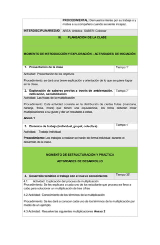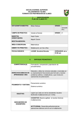 Este documento presenta el plan de clases de una maestra para una lección sobre multiplicación de tres cifras. La lección incluye explicaciones del proceso de multiplicación, ejemplos para practicar y una evaluación final. El objetivo es que los estudiantes aprendan a resolver multiplicaciones de tres cifras de forma rápida y correcta.