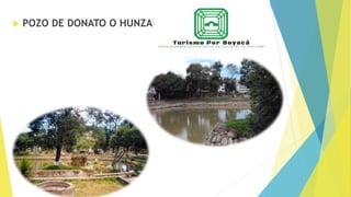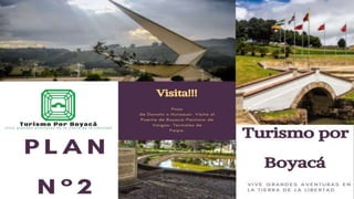 Este documento presenta un plan turístico de 2 días que incluye visitas al Pozo de Donato, Puente de Boyacá, Pantano de Vargas y las Termas de Paipa. El plan ofrece desayuno, guía turístico, transporte, entradas y hospedaje. Los costos por persona son de $150.000, para 2 personas $240.000 y para grupos de 6-7 personas $1.399.000.