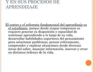 El documento enfatiza que el estudiante es el eje central del aprendizaje, destacando la importancia de fomentar su disposición y habilidades críticas desde temprana edad. Se menciona la necesidad de planificar el aprendizaje mediante estrategias didácticas y ambientes colaborativos, además de reconocer la importancia de evaluar los desempeños para tomar decisiones pedagógicas. También se subraya el desarrollo de competencias esenciales para la vida, como el aprendizaje permanente, manejo de la información y convivencia social.
