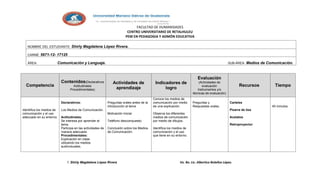 Este documento presenta un plan de lección sobre los medios de comunicación para el área de Comunicación y Lenguaje. La lección incluye objetivos declarativos, actitudinales y procedimentales, actividades de aprendizaje, indicadores de logro, evaluación, recursos y tiempo requerido.
