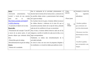 El documento presenta la planificación de una clase de primer año básico sobre la letra M. La clase tiene como objetivo principal que los estudiantes lean y escriban palabras aplicando el conocimiento de la correspondencia entre letra y sonido de la letra M. La clase consta de tres fases - inicio, desarrollo y cierre - e incluye actividades como una canción, presentación en power point, guía de trabajo y retroalimentación para cumplir los objetivos de aprendizaje de reconocer y escribir sílabas y palabras con la letra M.