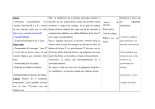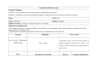 El resumen describe una lección de lectura y escritura para estudiantes de primer grado que se enfoca en reconocer e identificar la letra P y sus sílabas. La lección incluye actividades como completar oraciones con sílabas de la P, colocar imágenes en un tablero de la letra P, y preguntas al final para revisar el aprendizaje. El objetivo es que los estudiantes puedan leer y escribir palabras que contengan la letra P.