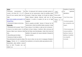 El resumen describe una lección de primer grado que se enfoca en reconocer e identificar la letra P y sus sílabas. La lección incluye dos actividades principales: 1) completar una guía de trabajo identificando letras y 2) armar oraciones con fichas que contienen palabras con la letra P. El objetivo es que los estudiantes puedan leer palabras aisladas y en contexto aplicando su conocimiento de correspondencia letra-sonido.