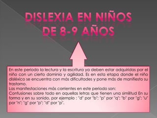 Este documento describe las dificultades que experimentan los niños disléxicos en la lectura y escritura, incluyendo confusiones de letras, inversiones, omisiones y sustituciones. También propone estrategias pedagógicas como corregir la postura y posición del papel, y técnicas para modificar la lectoescritura y esquema corporal del niño. El diagnóstico y tratamiento temprano son fundamentales para ayudar al niño a superar sus dificultades.