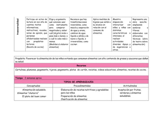 Este documento describe una situación didáctica sobre la alimentación saludable. El objetivo es promover una alimentación sana entre los niños y evitar que consuman alimentos con alto contenido de grasa y azúcar. La situación incluye diversas actividades como clasificar alimentos, elaborar recetas nutritivas, y aprender sobre los beneficios de una dieta balanceada.