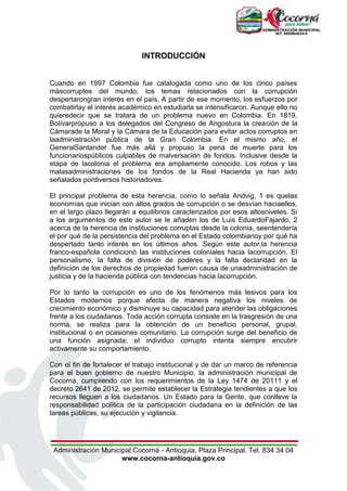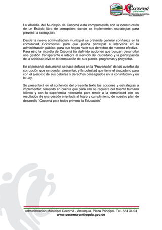 La administración municipal de Cocorná, Antioquia presenta un plan para prevenir la corrupción en línea con la ley colombiana. El plan busca generar confianza en la comunidad a través de una gestión transparente e íntegra al servicio del ciudadano, identificando riesgos de corrupción y desarrollando estrategias para mitigarlos. La alcaldía se compromete a implementar acciones para prevenir la corrupción y promover la participación ciudadana.